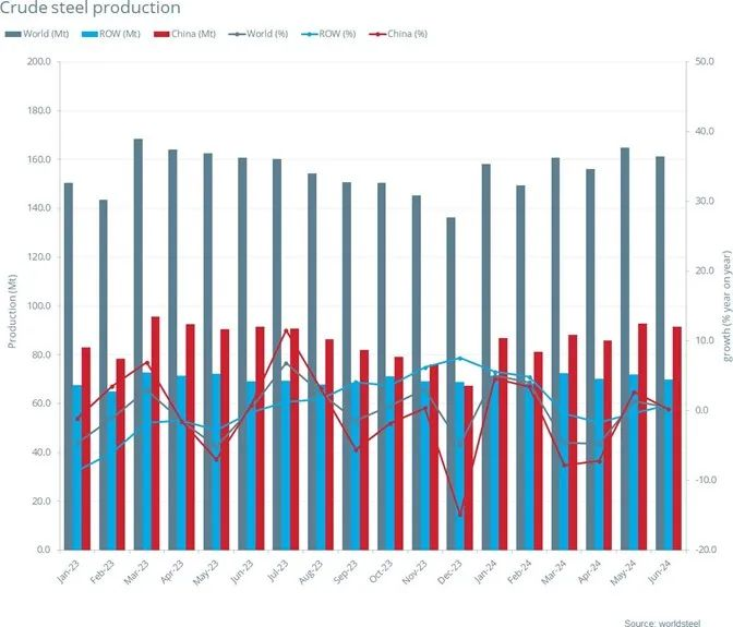 2024年6月全球71個納入世界鋼鐵協(xié)會統(tǒng)計國家的粗鋼產(chǎn)量為1.614億噸,同比提高0.5%。