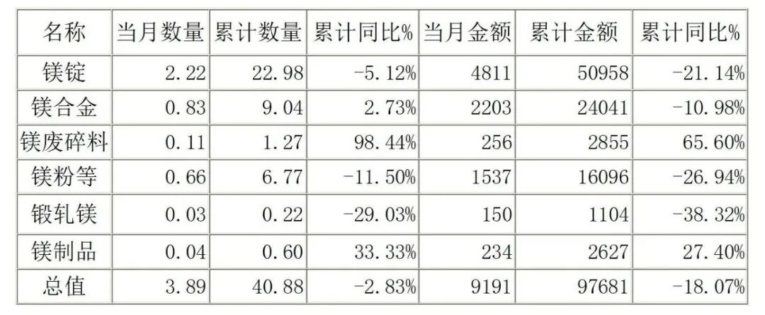 2025年1-11月中國各類鎂產品出口統(tǒng)計情況