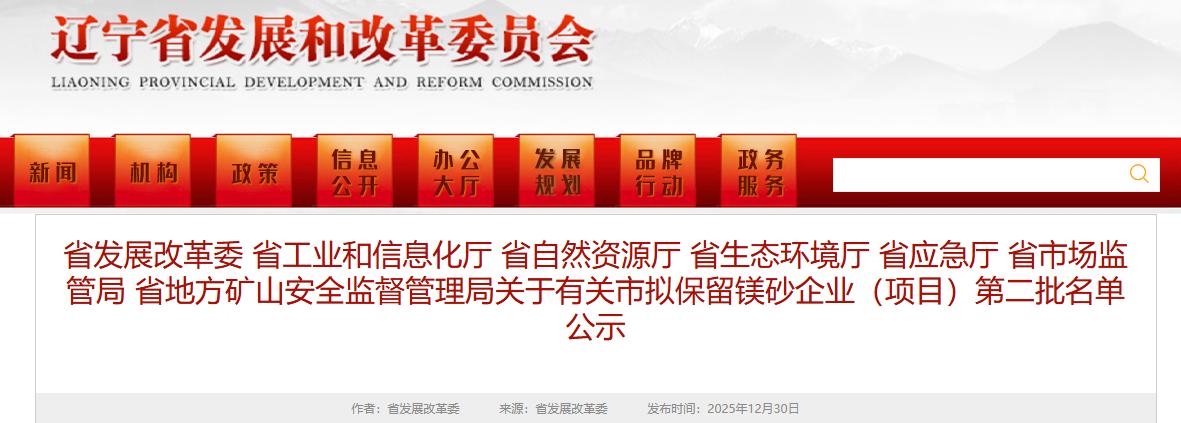 根據(jù)《遼寧省人民政府辦公廳關(guān)于推進菱鎂行業(yè)高質(zhì)量發(fā)展的實施意見》(遼政辦發(fā)〔2023〕15號)、《遼寧省人民政府辦公廳關(guān)于印發(fā)遼寧省菱鎂行業(yè)專項整治方案的通知》(遼政辦發(fā)〔2023〕34號)要求,有關(guān)市政府向省菱鎂行業(yè)高質(zhì)量發(fā)展領(lǐng)導小組辦公室報送了本市擬保留鎂砂企業(yè)(項目)名單,現(xiàn)將相關(guān)企業(yè)(項目)名單有關(guān)情況面向社會公示,公示期5個工作日。