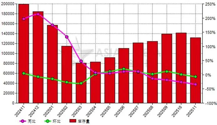 11月份中國鱗片石墨生產(chǎn)商庫存鱗片石墨為131,500.00公噸,去年同期為199,000.00公噸,上月為141,500.00公噸,同比減少33.92%,環(huán)比減少7.07%。