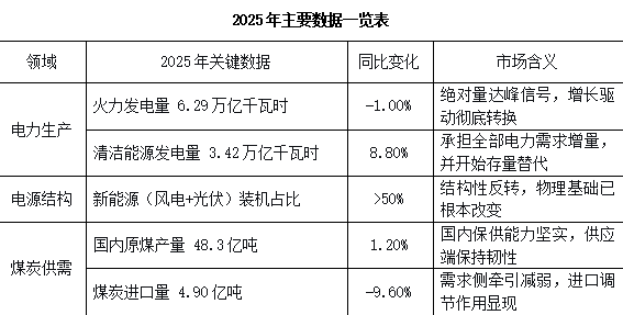 2025年的中國能源數(shù)據(jù)顯示,電力系統(tǒng)轉(zhuǎn)型已進(jìn)入標(biāo)志性的新階段。全國規(guī)模以上工業(yè)發(fā)電量同比增長2.2%,但火力發(fā)電量同比下降1.0%,為歷史首次。與此同時(shí),風(fēng)電和光伏發(fā)電裝機(jī)容量占比首次突破50%,實(shí)現(xiàn)了對火電裝機(jī)的歷史性超越。在國內(nèi)原煤產(chǎn)量創(chuàng)新高、進(jìn)口煤量回落的情況下,這些變化預(yù)示著能源基本面與市場邏輯正在發(fā)生深刻轉(zhuǎn)變。