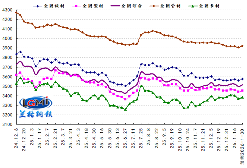 2026年第4周(2026.1.19-1.23)蘭格鋼鐵全國絕對價(jià)格指數(shù)為3500元,較上周下降0.6%,較去年同期下降5.0%;其中,蘭格鋼鐵長材絕對價(jià)格指數(shù)為3370元,較上周下降1.0%,較去年同期下降4.3%;蘭格鋼鐵型材絕對價(jià)格指數(shù)為3440元,較上周下降0.6%,較去年同期下降3.8%;蘭格鋼鐵板材絕對價(jià)格指數(shù)為3561元,較上周下降0.4%,較去年同期下降5.8%;蘭格鋼鐵管材絕對價(jià)格指數(shù)為3907元,較上周下降0.3%,較去年同期下降5.3%。