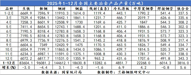 表1 2025年1-12月全國主要冶金產(chǎn)品產(chǎn)量