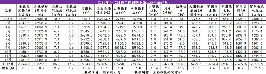 表2 2025年1-12月全國鋼鐵下游工業(yè)產(chǎn)品產(chǎn)量