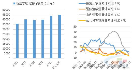 基建方面,我們判斷2026年投資將回正,基建端水泥需求將有改善。“十五五”規(guī)劃建議指出,加強謀劃論證,實施一批重大標志性工程項目,高質(zhì)量推進國家重大戰(zhàn)略實施和重點領(lǐng)域安全能力項目建設(shè)。2026年作為“十五五”開局之年,預(yù)計專項債、超長期特別國債發(fā)行規(guī)模將出現(xiàn)提高,基建投資將出現(xiàn)回正,但在化債政策影響下,水泥需求關(guān)系密切的交通類和市政基建投資或?qū)⒀永m(xù)低迷態(tài)勢,預(yù)計基建整體對水泥需求支撐將有所改善,但力度可能仍然不強。