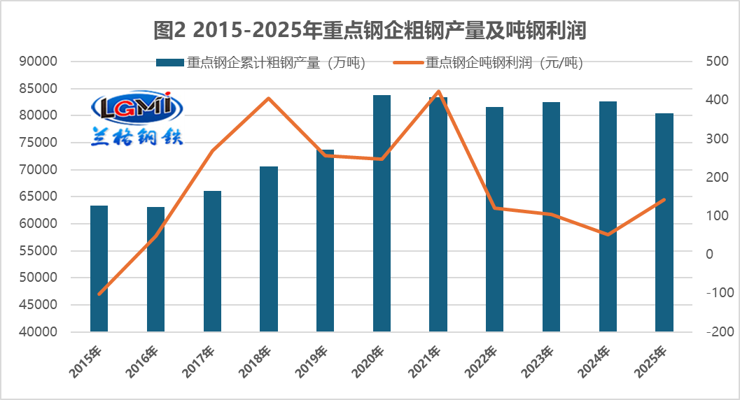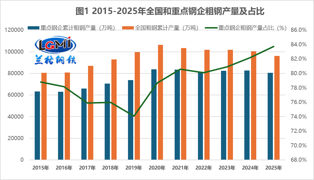 據(jù)中國鋼鐵工業(yè)協(xié)會權(quán)威統(tǒng)計數(shù)據(jù)顯示,2025年重點統(tǒng)計鋼鐵企業(yè)經(jīng)營成績單亮點突出:累計營業(yè)收入達6.1萬億元,雖受鋼材價格震蕩下行影響同比下降 3.1%,但降幅顯著小于市場預(yù)期;營業(yè)成本控制成效顯著,降至5.7萬億元,同比下降4.5%,成本端收縮力度大于收入端回落幅度;利潤總額實現(xiàn)1151億元,同比大幅增長1.4倍,盈利規(guī)模實現(xiàn)跨越式修復(fù),成為行業(yè)發(fā)展的核心亮點。從鋼鐵產(chǎn)量來看,2025年重點鋼鐵企業(yè)在兼顧市場需求與供給優(yōu)化的前提下,產(chǎn)量結(jié)構(gòu)呈現(xiàn) "穩(wěn)中有調(diào)" 的特征;其中,重點鋼鐵企業(yè)粗鋼產(chǎn)量8.05億噸,占全國粗鋼總產(chǎn)量的83.8%,同比下降2.7%,累計日產(chǎn)220.46萬噸;生鐵產(chǎn)量 7.32 億噸,占全國生鐵產(chǎn)量的87.6%,同比微降0.7%,累計日產(chǎn)200.56萬噸;鋼材產(chǎn)量 8.26億噸,占全國鋼材產(chǎn)量的57.1%,同比增長0.9%,累計日產(chǎn)226.22萬噸。從2015-2025年長期趨勢來看(詳見圖 1),重點鋼企粗鋼產(chǎn)量占全國比重呈現(xiàn)穩(wěn)步提升態(tài)勢,從20159年的74.1% 逐步攀升至2025年的83.8%,反映出行業(yè)集中度持續(xù)優(yōu)化,頭部企業(yè)的規(guī)模優(yōu)勢與資源整合能力不斷凸顯。