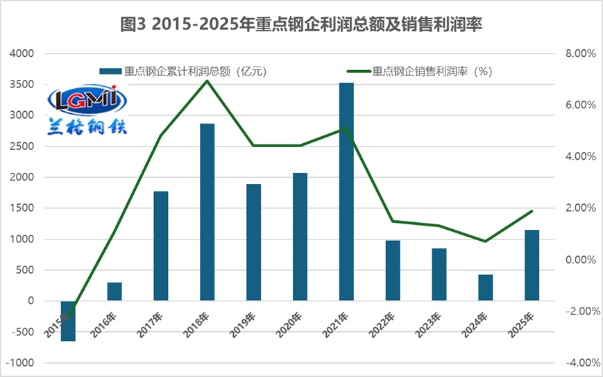 從盈利能力來看,2025年重點鋼鐵企業(yè)盈利水平實現(xiàn)實質(zhì)性改善,噸鋼盈利達到143元,較上年同期增加91元,不僅一舉扭轉(zhuǎn)了此前盈利低迷的局面,還較鋼鐵行業(yè)整體噸鋼盈利高出29元,彰顯出重點鋼企在成本控制與產(chǎn)品溢價方面的核心優(yōu)勢(詳見圖 2)。從盈利效率來看,2025年重點鋼鐵企業(yè)成本利潤率為2.02%,較上年上升1.27個百分點;銷售利潤率為1.89%,較上年上升1.18個百分點(詳見圖 3),兩大利潤率指標的同步回升,標志著企業(yè)經(jīng)營質(zhì)量的穩(wěn)步提升,盈利的可持續(xù)性顯著增強。