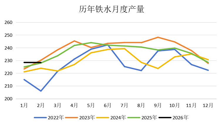 從歷年鐵水的數(shù)據(jù)來看,節(jié)后鋼企產(chǎn)量恢復速度較快,2026年初的鐵水產(chǎn)量處于歷史同期高位水平,且市場對未來需求持較大疑問,今年節(jié)后產(chǎn)量預計會逐漸恢復,但恢復速度還有待觀察。