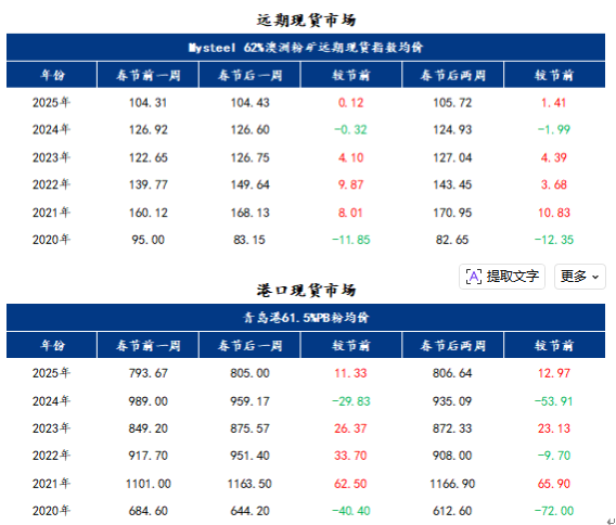 2026年春節(jié)長(zhǎng)假期間進(jìn)口鐵礦石遠(yuǎn)期現(xiàn)貨市場(chǎng)的整體活躍度較弱,公開(kāi)平臺(tái)上沒(méi)有任何市場(chǎng)價(jià)格信息出現(xiàn),也未注意到有礦山進(jìn)行單獨(dú)進(jìn)行私下的議標(biāo);二級(jí)市場(chǎng)中主要的市場(chǎng)參與者多數(shù)處于休假的狀態(tài)中,未注意到有詢報(bào)盤(pán)及市場(chǎng)成交信息的出現(xiàn)。