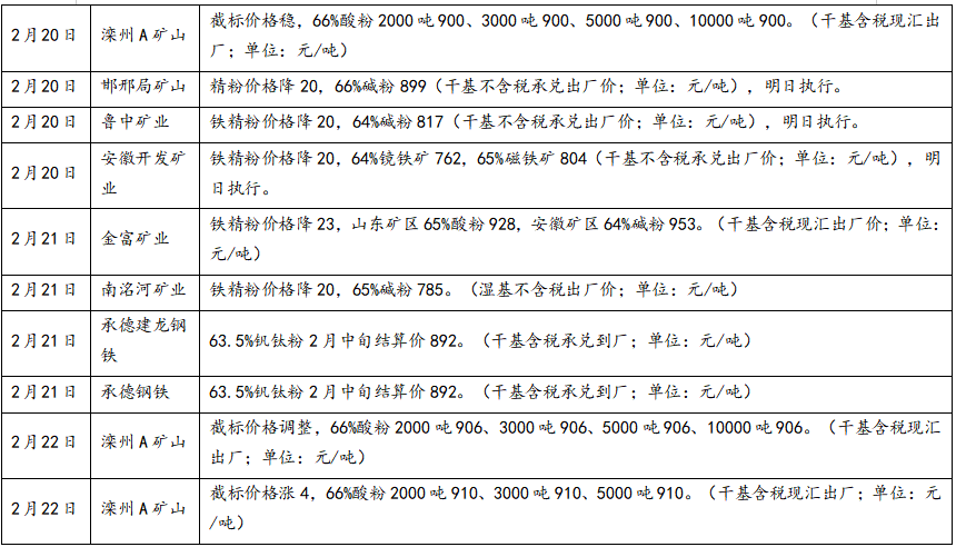 春節(jié)假期期間,多數(shù)鋼企已提前補(bǔ)庫(kù)完成,僅個(gè)別鋼企少量采購(gòu)國(guó)內(nèi)礦精粉,受外盤(pán)市場(chǎng)下行影響,部分地區(qū)精粉價(jià)格下調(diào),整體市場(chǎng)偏弱運(yùn)行。假期期間部分鋼企、礦山調(diào)價(jià)信息如下: