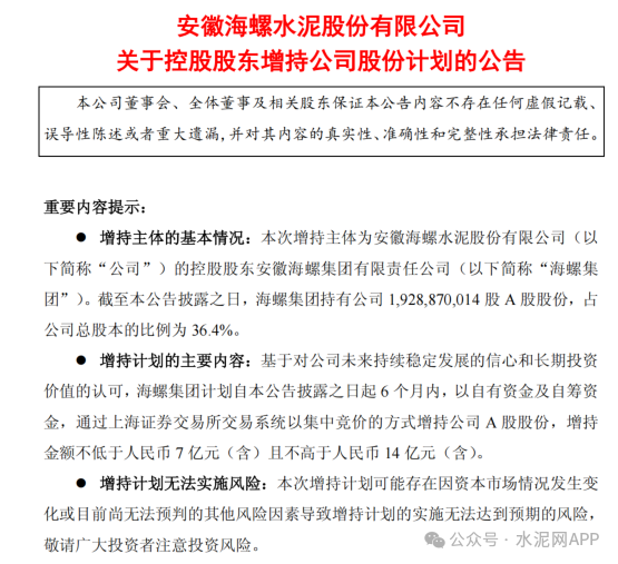 2月25日,海螺水泥發(fā)布公告稱,基于對(duì)公司未來(lái)持續(xù)穩(wěn)定發(fā)展的信心和長(zhǎng)期投資價(jià)值的認(rèn)可,公司控股股東海螺集團(tuán)計(jì)劃自公告披露之日起6個(gè)月內(nèi),以自有資金及自籌資金,通過(guò)上海證券交易所交易系統(tǒng)以集中競(jìng)價(jià)的方式增持公司A股股份,增持金額不低于人民幣7億元(含)且不高于人民幣14億元(含)。