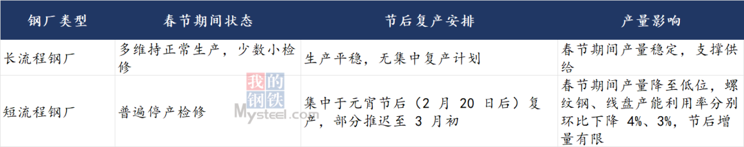 二、供應情況:高爐電爐分化,節(jié)后復產節(jié)奏偏緩春節(jié)期間供應呈現(xiàn)“高爐穩(wěn)產、電爐停產”的顯著分化特征,具體情況如下。