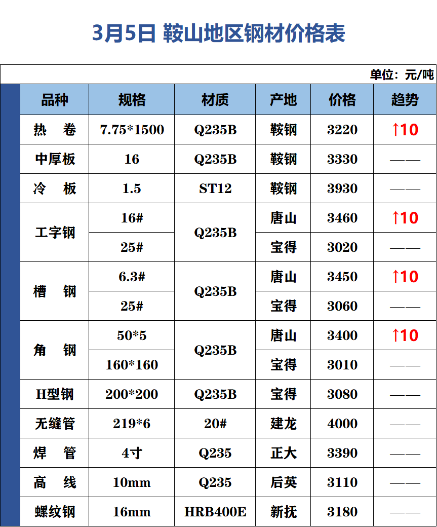 3月5日 鞍山地區(qū)鋼材價(jià)格表