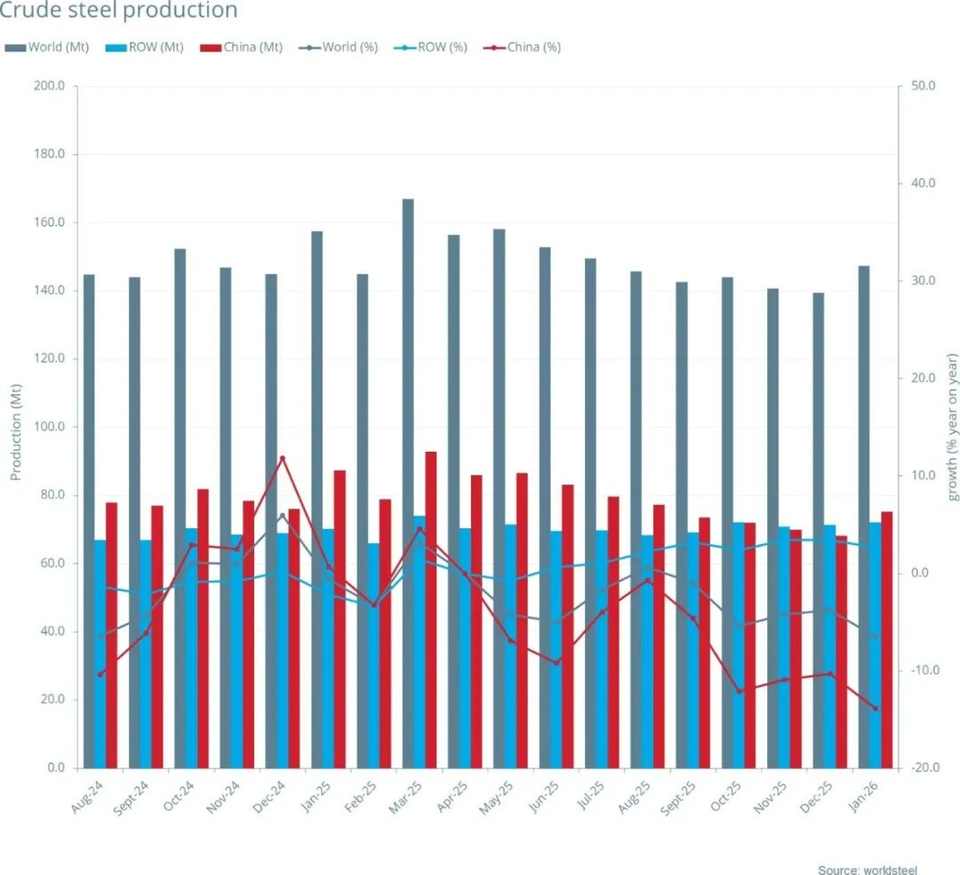 2026年1月全球69個(gè)納入世界鋼鐵協(xié)會(huì)統(tǒng)計(jì)國(guó)家/地區(qū)的粗鋼產(chǎn)量為1.473億噸,同比下降6.5%。