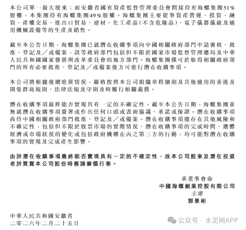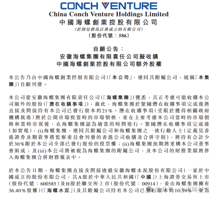2月25日晚間,海螺創(chuàng)業(yè)發(fā)布公告,安徽海螺集團有限責任公司正考慮可能收購公司額外股份。收購完成后,海螺集團將直接及間接持有公司已發(fā)行股本約21%。