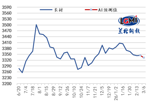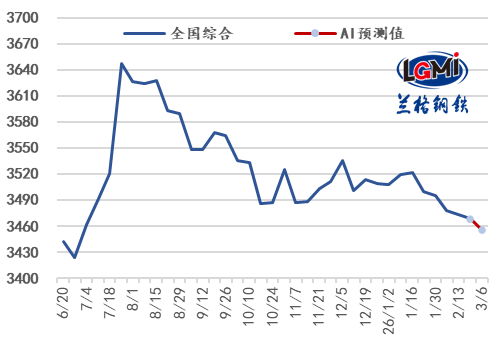 2026年第9周(2026.2.23-2.27)蘭格鋼鐵全國(guó)絕對(duì)價(jià)格指數(shù)為3469元,較節(jié)前下降0.1%,較去年同期下降5.6%;其中,蘭格鋼鐵長(zhǎng)材絕對(duì)價(jià)格指數(shù)為3345元,與節(jié)前持平,較去年同期下降4.8%;蘭格鋼鐵型材絕對(duì)價(jià)格指數(shù)為3399元,與節(jié)前持平,較去年同期下降6.6%;蘭格鋼鐵板材絕對(duì)價(jià)格指數(shù)為3526元,較節(jié)前下降0.4%,較去年同期下降6.0%;蘭格鋼鐵管材絕對(duì)價(jià)格指數(shù)為3879元,與節(jié)前持平,較去年同期下降6.2%。