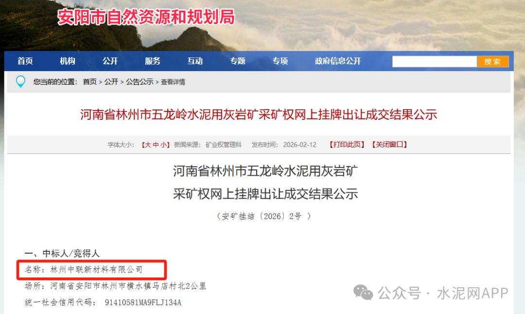 日前,河南安陽市自然資源和規(guī)劃局發(fā)布林州市五龍嶺水泥用灰?guī)r礦采礦權(quán)掛牌出讓成交結(jié)果,安陽中聯(lián)水泥全資子公司林州中聯(lián)新材料有限公司底價(jià)1.67億元競(jìng)得該礦權(quán)。