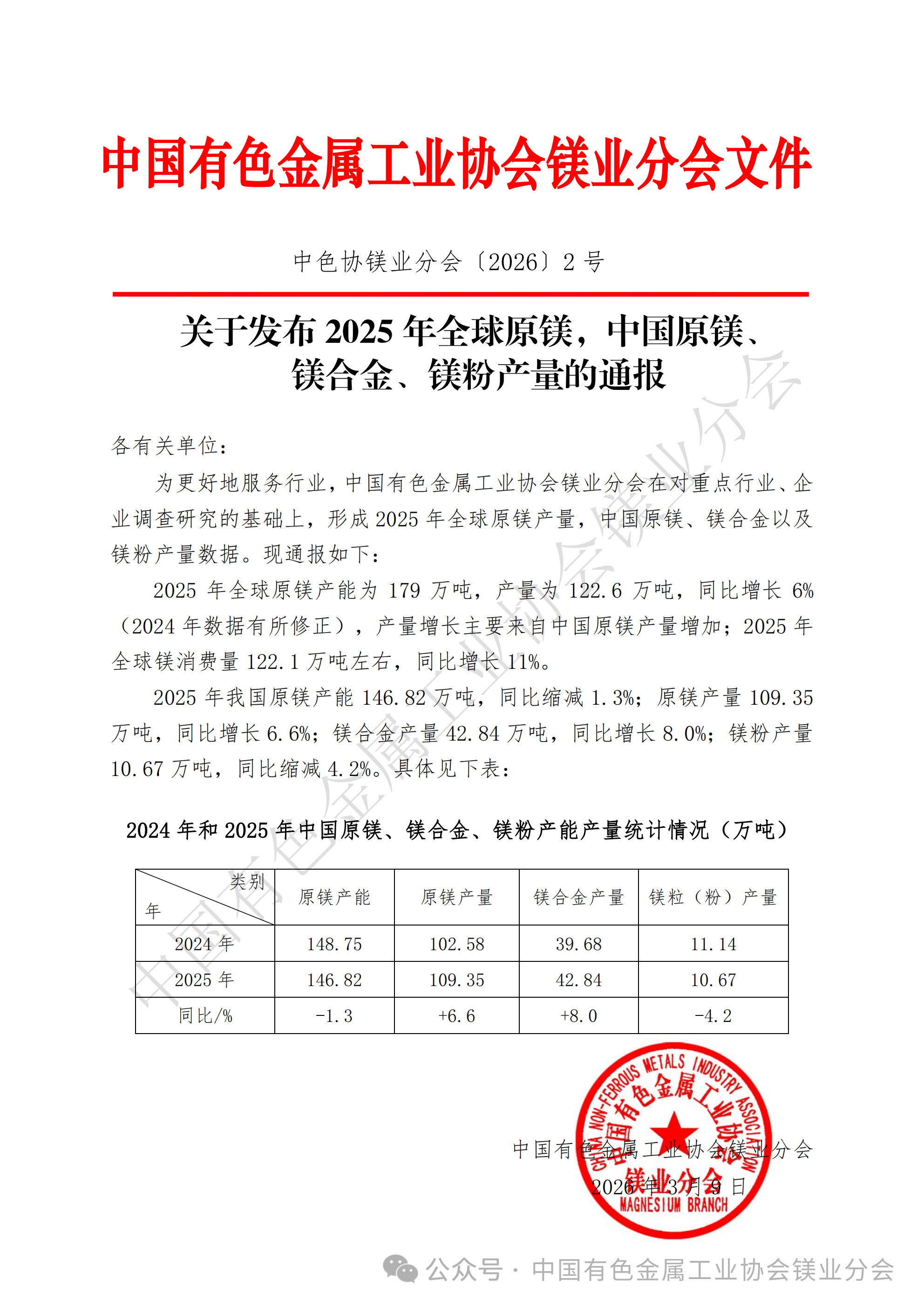 中國(guó)有色金屬工業(yè)協(xié)會(huì)鎂業(yè)分會(huì)關(guān)于發(fā)布2025年全球原鎂,中國(guó)原鎂、鎂合金、鎂粉產(chǎn)量的通報(bào)