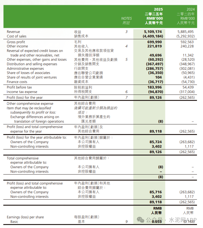3月9日晚間,亞洲水泥(中國)發(fā)布截至2025年12月31日止年度業(yè)績,該集團(tuán)取得收益51.09億元,同比減少13.19%;公司擁有人應(yīng)占盈利(歸母凈利潤)8572.4萬元,2024年同期虧損2.64億元。公告稱,收益減少主要由于本集團(tuán)產(chǎn)品銷量及平均售價(jià)于2025年下降所致。