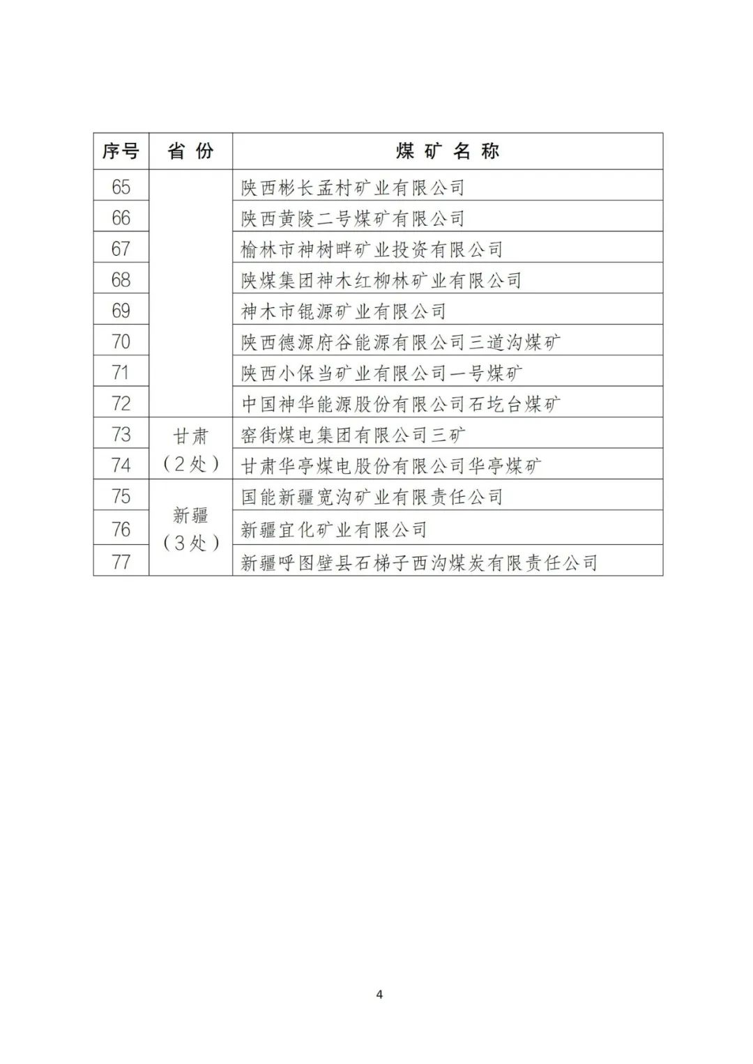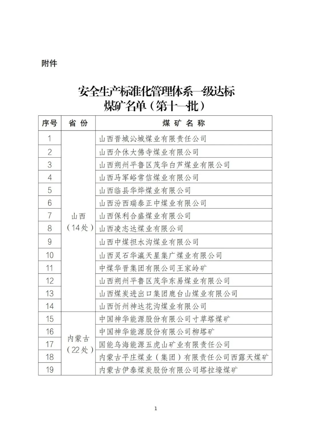 礦安〔2024〕76號(hào)各產(chǎn)煤省、自治區(qū)及新疆生產(chǎn)建設(shè)兵團(tuán)煤礦安全監(jiān)管部門(mén)、煤炭行業(yè)管理部門(mén),國(guó)家礦山安全監(jiān)察局各省級(jí)局,有關(guān)中央企業(yè):按照《煤礦安全生產(chǎn)標(biāo)準(zhǔn)化管理體系考核定級(jí)辦法(試行)》(煤安監(jiān)行管〔2020〕16號(hào))等規(guī)定,經(jīng)資料審查、現(xiàn)場(chǎng)檢查抽查、網(wǎng)上公示,確認(rèn)山西晉城沁城煤業(yè)有限責(zé)任公司等77處煤礦(詳見(jiàn)附件)為安全生產(chǎn)標(biāo)準(zhǔn)化管理體系一級(jí)達(dá)標(biāo)煤礦,現(xiàn)予以公布。自公布之日起生效,有效期3年,符合相關(guān)條件的,可申請(qǐng)自動(dòng)延期。根據(jù)《關(guān)于大力推進(jìn)煤礦安全生產(chǎn)標(biāo)準(zhǔn)化建設(shè)工作的通知》(安監(jiān)總煤行〔2017〕59號(hào))、《關(guān)于進(jìn)一步完善煤炭產(chǎn)能置換政策加快優(yōu)質(zhì)產(chǎn)能釋放促進(jìn)落后產(chǎn)能有序退出的通知》(發(fā)改辦能源〔2018〕151號(hào))、《關(guān)于印發(fā)煤礦生產(chǎn)能力管理辦法和核定標(biāo)準(zhǔn)的通知》(應(yīng)急〔2021〕30號(hào))等有關(guān)規(guī)定,上述77處煤礦在安全生產(chǎn)標(biāo)準(zhǔn)化管理體系一級(jí)等級(jí)有效期內(nèi)享受以下激勵(lì)政策:一、在全國(guó)性或區(qū)域性調(diào)整、實(shí)施減量化生產(chǎn)措施時(shí),原則上不納入減量化生產(chǎn)煤礦范圍。二、在地方政府因其他煤礦發(fā)生事故采取區(qū)域政策性停產(chǎn)措施時(shí),原則上不納入停產(chǎn)范圍。三、申請(qǐng)生產(chǎn)能力核增時(shí),在同等條件下,可優(yōu)先開(kāi)展審查確認(rèn)工作;新投產(chǎn)的煤礦和已核定生產(chǎn)能力的煤礦,通過(guò)生產(chǎn)能力核定提高產(chǎn)能規(guī)模的間隔時(shí)間,可按規(guī)定縮短。四、生產(chǎn)能力核增時(shí),產(chǎn)能置換比例不小于核增產(chǎn)能的100%,通過(guò)改擴(kuò)建、技術(shù)改造增加優(yōu)質(zhì)產(chǎn)能超過(guò)120萬(wàn)噸/年以上的,所需產(chǎn)能置換指標(biāo)折算比例可提高為200%。五、生產(chǎn)能力核增時(shí),核增幅度可在“不超過(guò)煤炭工業(yè)設(shè)計(jì)規(guī)范標(biāo)準(zhǔn)設(shè)計(jì)井型規(guī)模2級(jí)級(jí)差”規(guī)定的基礎(chǔ)上,上浮1級(jí)級(jí)差;實(shí)現(xiàn)“一井一面”或智能化開(kāi)采的,核增幅度可上浮2級(jí)級(jí)差。六、在安全生產(chǎn)許可證有效期屆滿時(shí),符合相關(guān)條件的,可以直接辦理延期手續(xù)。七、銀行保險(xiǎn)、證券、擔(dān)保等主管部門(mén)作為對(duì)煤礦企業(yè)信用評(píng)級(jí)重要參考依據(jù)。八、各級(jí)煤礦安全監(jiān)管監(jiān)察部門(mén)適當(dāng)減少檢查頻次;煤礦停產(chǎn)后復(fù)產(chǎn)驗(yàn)收時(shí),優(yōu)先進(jìn)行復(fù)產(chǎn)驗(yàn)收。附件:安全生產(chǎn)標(biāo)準(zhǔn)化管理體系一級(jí)達(dá)標(biāo)煤礦名單(第十一批)