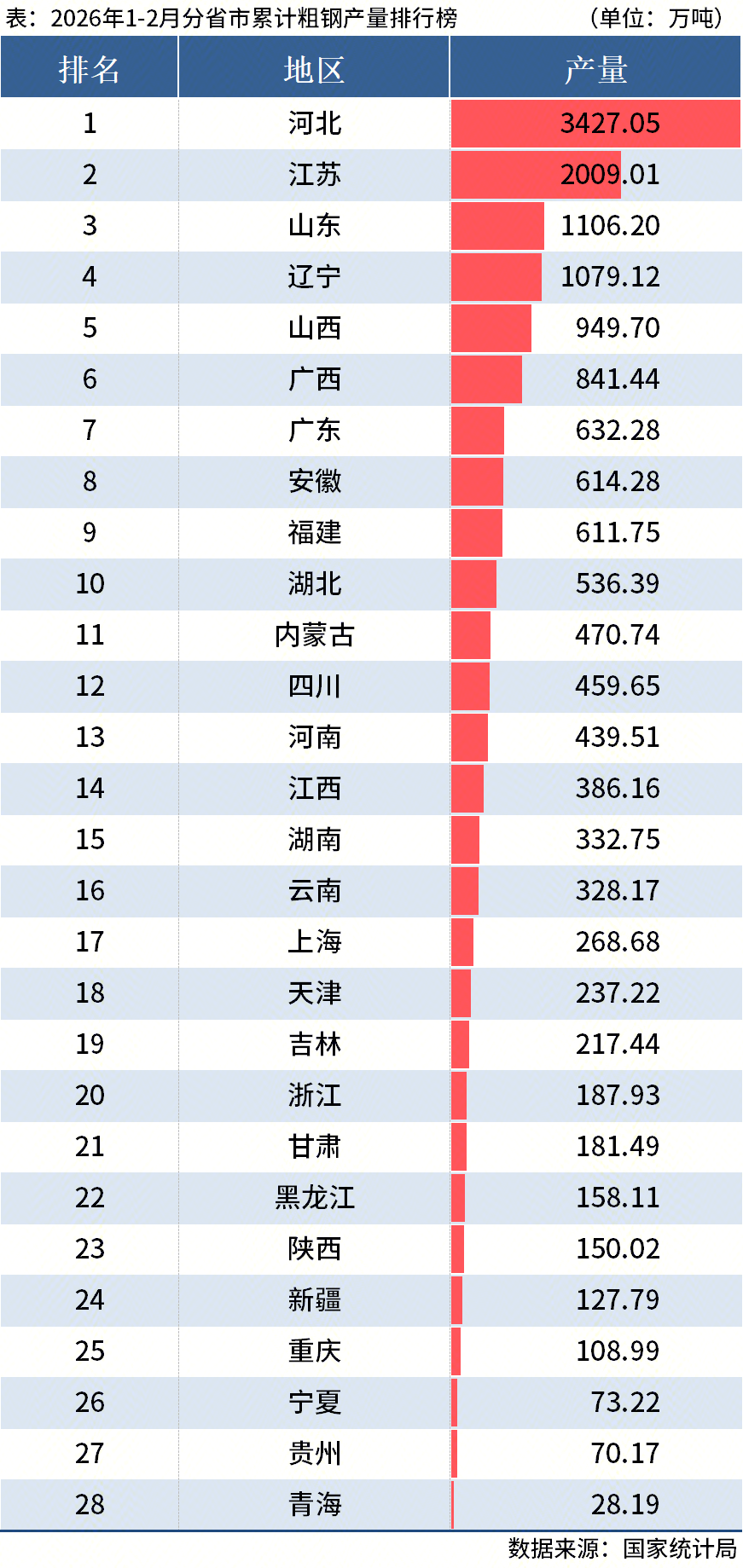 國家統(tǒng)計(jì)局?jǐn)?shù)據(jù)顯示,2026年1-2月中國粗鋼產(chǎn)量16033.5萬噸,同比下降3.6%。
