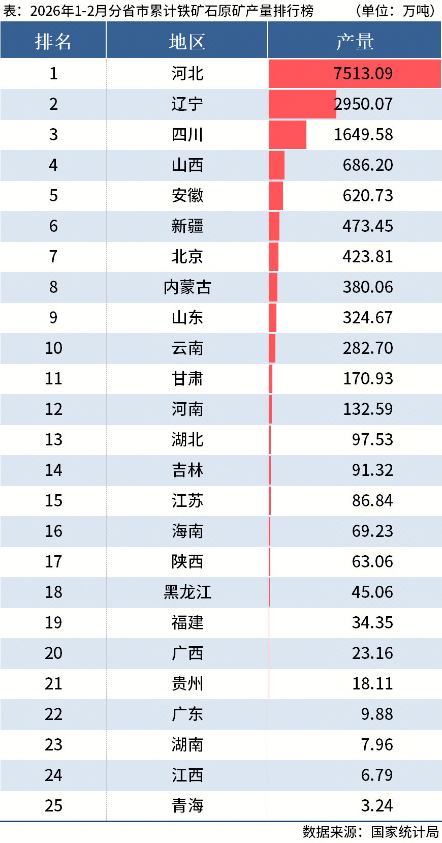 國家統(tǒng)計(jì)局?jǐn)?shù)據(jù)顯示,2026年1-2月中國鐵礦石原礦產(chǎn)量16164.4萬噸,同比增長1.3%。