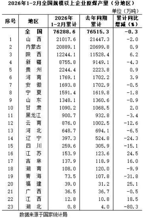2026年1-2月份全國(guó)規(guī)模以上分省區(qū)原煤產(chǎn)量數(shù)據(jù)發(fā)布
