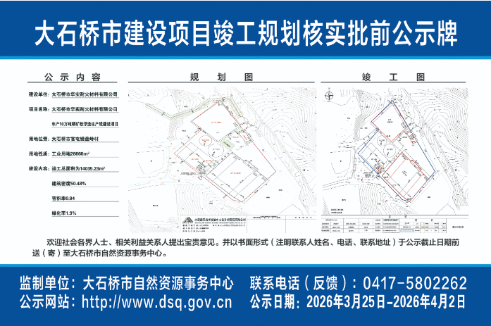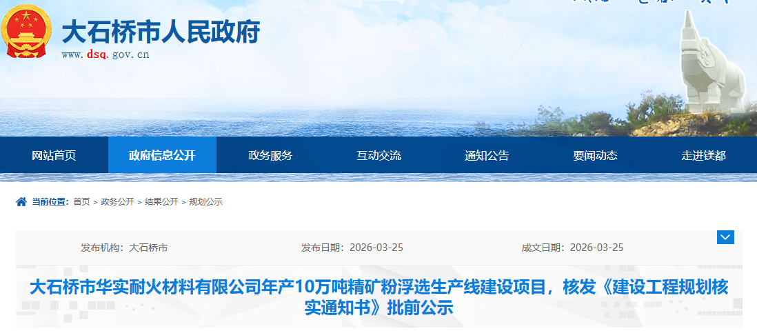 大石橋市華實耐火材料有限公司年產(chǎn)10萬噸精礦粉浮選生產(chǎn)線建設項目,核發(fā)《建設工程規(guī)劃核實通知書》批前公示