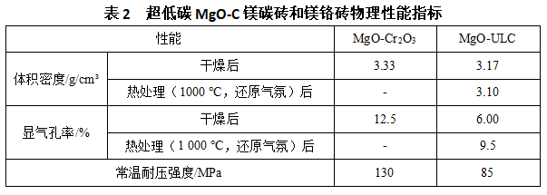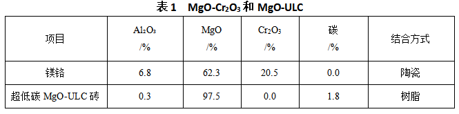 首先在試驗(yàn)室對(duì)超低碳鎂碳磚和鎂鉻磚兩種材料物理性能測(cè)試,以評(píng)估和比較MgO-Cr2O3和MgO-ULC 材料的物理、機(jī)械和化學(xué)特性。檢測(cè)結(jié)果如表2所示。雖然與傳統(tǒng)鎂鉻磚相比,超低碳鎂碳磚的性能有所降低,但滿足使用要求。
