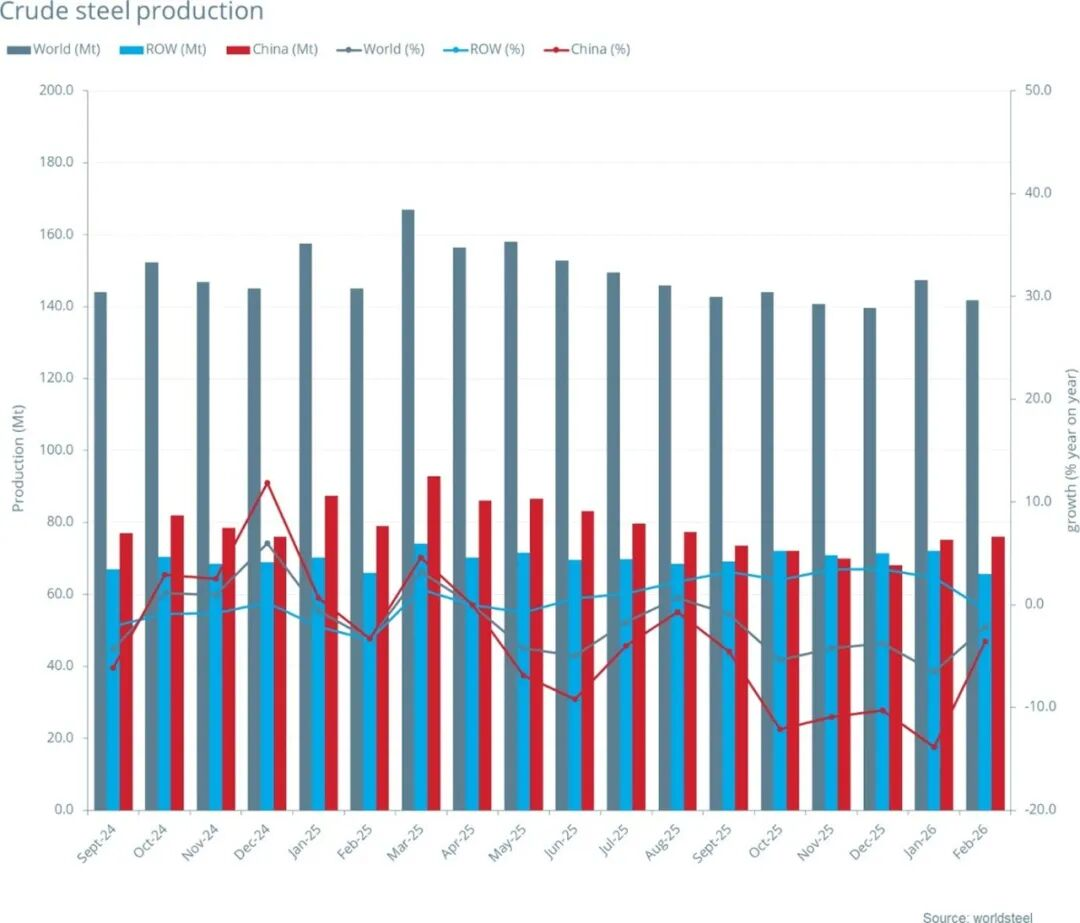 2026年2月全球69個(gè)納入世界鋼鐵協(xié)會(huì)統(tǒng)計(jì)國(guó)家/地區(qū)的粗鋼產(chǎn)量為1.418億噸,同比下降2.2%。