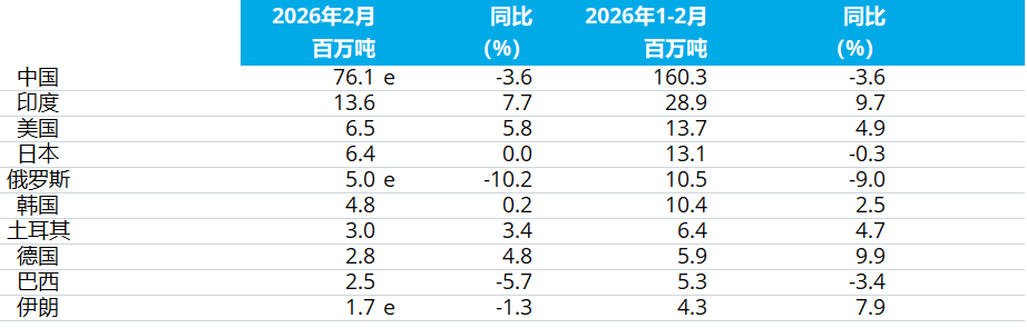 2026年2月全球粗鋼產(chǎn)量