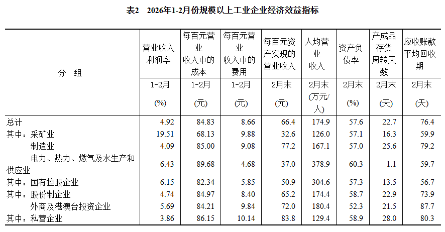 1—2月份,規(guī)模以上工業(yè)企業(yè)實(shí)現(xiàn)營(yíng)業(yè)收入20.84萬億元,同比增長(zhǎng)5.3%;發(fā)生營(yíng)業(yè)成本17.68萬億元,增長(zhǎng)5.0%;營(yíng)業(yè)收入利潤(rùn)率為4.92%,同比上升0.43個(gè)百分點(diǎn)。