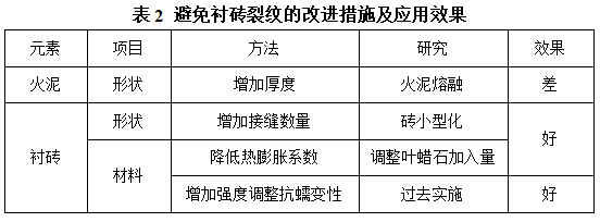 通過(guò)分析襯磚損毀機(jī)理,采取相應(yīng)改進(jìn)措施,見(jiàn)表2,并進(jìn)行相應(yīng)的應(yīng)用效果評(píng)估。通過(guò)改進(jìn)火泥及耐火磚參數(shù)來(lái)降低襯磚服役過(guò)程中產(chǎn)生的應(yīng)力集中度??梢钥闯?,由于火泥的耐用性不如耐火磚,因此增加火泥厚度達(dá)不到預(yù)期效果。減小耐火磚的尺寸后(磚長(zhǎng)由150 mm減小為80 mm),火泥接縫數(shù)量增加。通過(guò)模擬計(jì)算承接高溫鐵水時(shí)磚縫增加前后磚中應(yīng)力值對(duì)比可知,磚縫增加后,磚中最大主應(yīng)力指數(shù)下降50%,最小主應(yīng)力指數(shù)下降30%,應(yīng)力分布更均勻,可有效避免磚中裂紋的產(chǎn)生。
