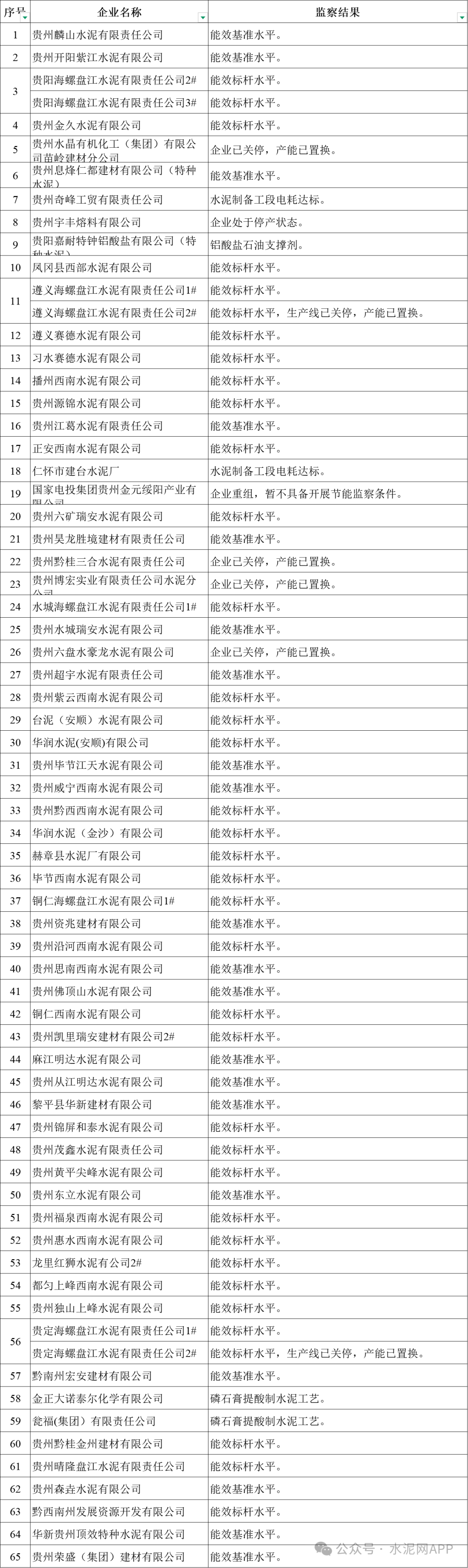 其中水泥企業(yè)共計(jì)65家,達(dá)到能效基準(zhǔn)水平的共計(jì)20家,達(dá)到能效標(biāo)桿水平的共計(jì)37家。具體見(jiàn)下表: