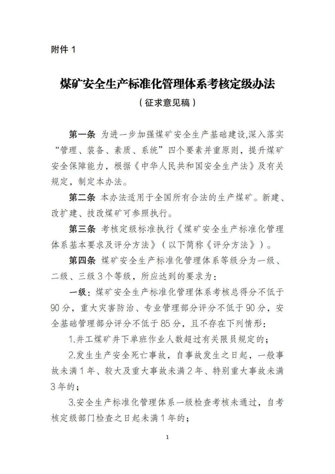 1.煤礦安全生產(chǎn)標(biāo)準(zhǔn)化管理體系考核定級(jí)辦法(征求意見(jiàn)稿)