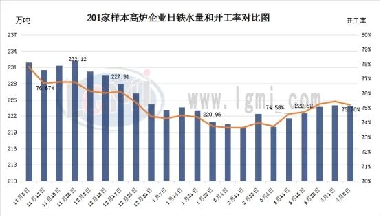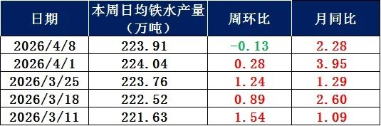 據(jù)調(diào)研,全國(guó)201家生產(chǎn)企業(yè)鐵水日均產(chǎn)量為223.91萬(wàn)噸,較上周下降0.13萬(wàn)噸;26年4月份日均鐵水產(chǎn)量為223.97萬(wàn)噸,日均產(chǎn)量環(huán)比3月增加1.97萬(wàn)噸。