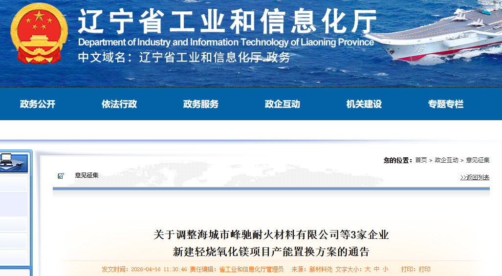 按照《遼寧省人民政府辦公廳關于推進菱鎂行業(yè)高質量發(fā)展的實施意見》(遼政辦發(fā)〔2023〕15號)、《省直7部門關于做好菱鎂行業(yè)專項整治有關工作意見的函》(遼發(fā)改工業(yè)字〔2026〕8號)、《遼寧省菱鎂礦浮選及鎂砂行業(yè)產(chǎn)能置換辦法》(遼工信建材〔2024〕18號)要求,根據(jù)企業(yè)的調(diào)整申請及鞍山市工信局初審,我廳于2026年3月31日至4月15日,對海城市峰馳耐火材料有限公司等3家企業(yè)新建輕燒氧化鎂項目產(chǎn)能置換方案進行了公示,公示期間無異議,現(xiàn)予通告。