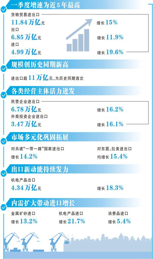 “今年以來(lái),外部形勢(shì)更加復(fù)雜多變,我國(guó)外貿(mào)起勢(shì)有力、開(kāi)局良好?!焙jP(guān)總署副署長(zhǎng)王軍表示,一季度進(jìn)出口超過(guò)11萬(wàn)億元,為歷史同期首次,季度增速也是近5年最高。