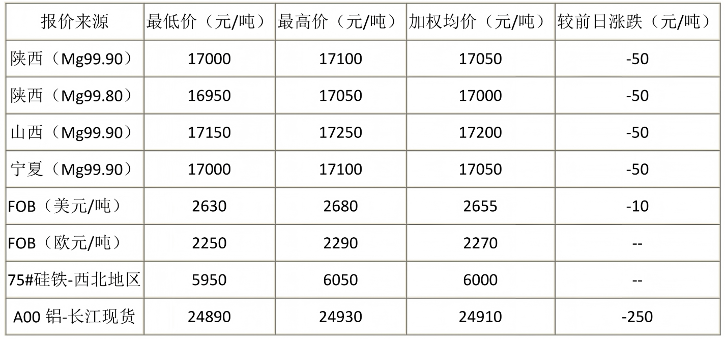 1. 報價原鎂均為符合GB/T 3499-2023《原生鎂錠》標(biāo)準(zhǔn)相應(yīng)牌號質(zhì)量要求的鎂錠;