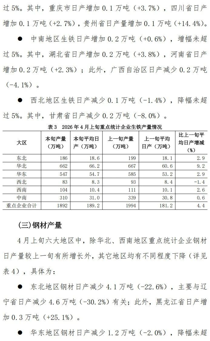 4月上旬重點統(tǒng)計企業(yè)鋼鐵產(chǎn)量旬報