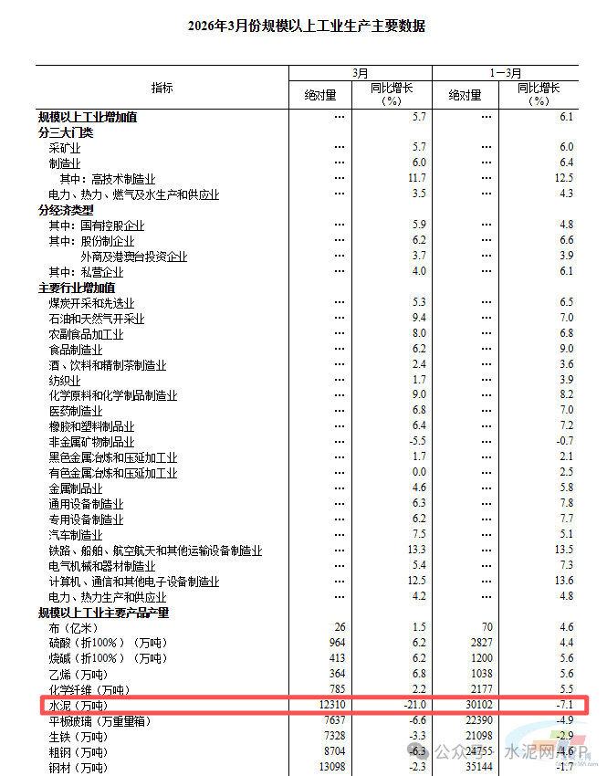 3月份,全國水泥產(chǎn)量12310萬噸,同比下降21%;一季度全國水泥產(chǎn)量30102萬噸,同比下降7.1%。