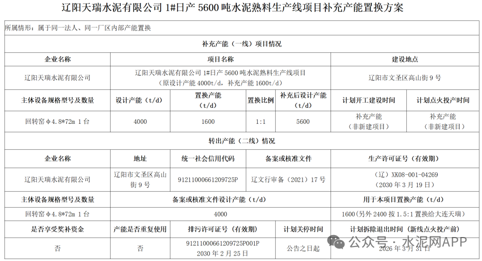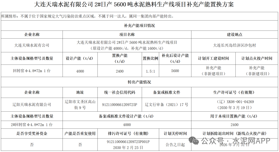 2026年1月16日,我廳按照工業(yè)和信息化部《水泥玻璃行業(yè)產(chǎn)能置換實(shí)施辦法》(工信部原〔2024〕206號(hào))有關(guān)規(guī)定及水泥行業(yè)產(chǎn)能管理相關(guān)政策要求,對(duì)遼陽(yáng)天瑞水泥有限公司1#日產(chǎn)5600噸、大連天瑞水泥有限公司2#日產(chǎn)5600噸水泥熟料生產(chǎn)線生產(chǎn)線補(bǔ)充產(chǎn)能置換方案進(jìn)行了公告,用于置換的退出產(chǎn)能為遼陽(yáng)天瑞水泥有限公司2#日產(chǎn)4000噸水泥熟料生產(chǎn)線產(chǎn)能。