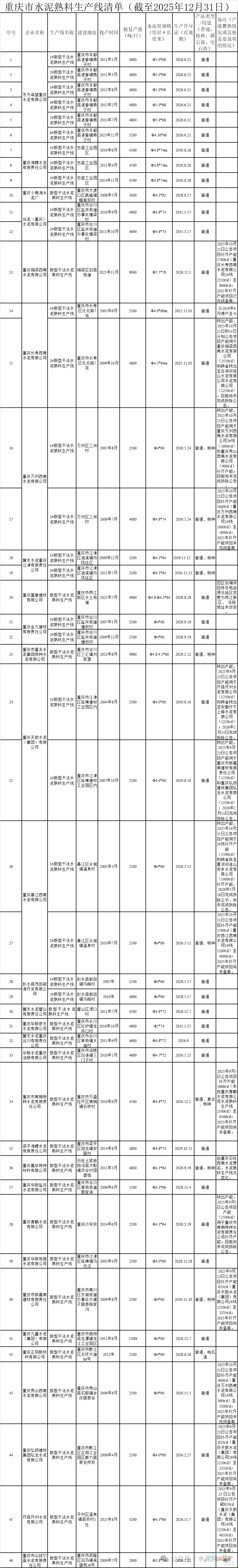 3、重慶長(zhǎng)壽西南水泥有限公司4800t/d、重慶萬州西南水泥有限公司2500t/d、重慶天助水泥(集團(tuán))有限公司2條2500t/d、重慶綦江西南水泥有限公司2500t/d、重慶青鵬水泥有限公司2000t/d產(chǎn)能已轉(zhuǎn)出。