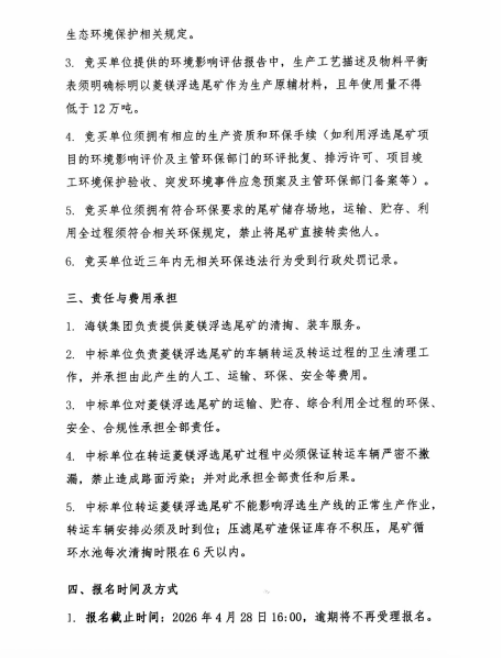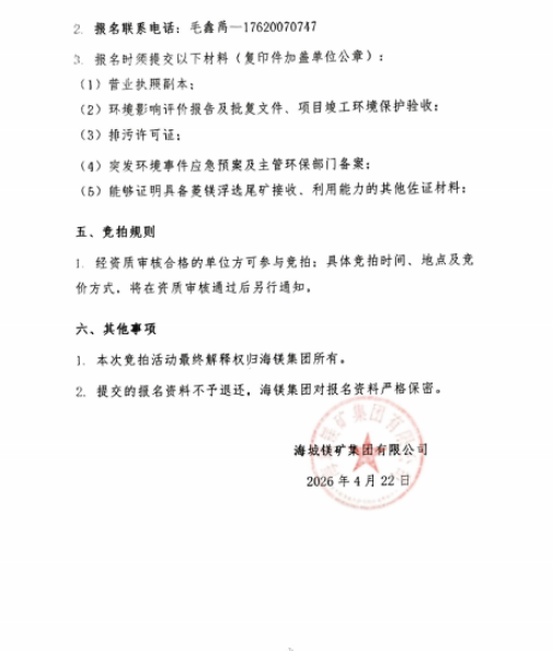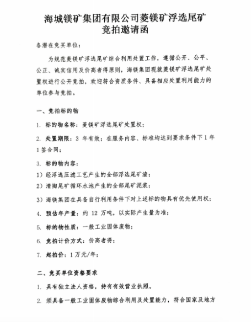 海城鎂礦集團(tuán)有限公司菱鎂礦浮選尾礦競(jìng)拍邀請(qǐng)函