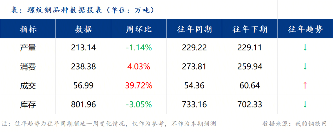 總結(jié):產(chǎn)量:當(dāng)前產(chǎn)量由增轉(zhuǎn)降,復(fù)產(chǎn)節(jié)奏放緩。本周螺紋鋼產(chǎn)量為213.14萬(wàn)噸,周環(huán)比下降1.14%(減少2.45萬(wàn)噸)。據(jù)Mysteel調(diào)研,本周137家螺紋鋼廠的開工率為41.64%,產(chǎn)能利用率為46.72%。減產(chǎn)主因部分鋼廠在盈利水平仍偏低的背景下進(jìn)行臨時(shí)檢修。預(yù)計(jì)下周產(chǎn)量或維持低位震蕩,生產(chǎn)節(jié)奏受利潤(rùn)制約。需求:表需連續(xù)第八周回升,增幅有所擴(kuò)大。本周螺紋鋼表觀消費(fèi)量為238.38萬(wàn)噸,周環(huán)比上漲4.03%(增加9.24萬(wàn)噸)。需求已進(jìn)入傳統(tǒng)旺季通道,且本周增幅較前幾周明顯提升,反映季節(jié)性需求正在逐步釋放。但絕對(duì)水平與歷史旺季相比仍有差距,房地產(chǎn)新開工疲軟仍是主要制約。預(yù)計(jì)下周表需在季節(jié)性支撐下或繼續(xù)溫和增加。成交:市場(chǎng)成交量明顯改善,終端采購(gòu)積極性上升。本周螺紋鋼成交量為56.99萬(wàn)噸,周環(huán)比上漲39.72%。期螺趨強(qiáng)運(yùn)行帶動(dòng)商家現(xiàn)貨報(bào)價(jià)主流順勢(shì)上調(diào),終端按需采購(gòu)與部分投機(jī)需求均有入場(chǎng)。預(yù)計(jì)下周成交在需求釋放與市場(chǎng)情緒回暖的背景下或維持活躍。庫(kù)存:總庫(kù)存連續(xù)第五周下降,去庫(kù)速度加快。本周螺紋鋼總庫(kù)存為801.96萬(wàn)噸,周環(huán)比下降3.05%(減少25.24萬(wàn)噸)。其中,鋼廠庫(kù)存200.62萬(wàn)噸,環(huán)比減少6.92萬(wàn)噸,降幅3.33%;社會(huì)庫(kù)存601.34萬(wàn)噸,環(huán)比減少18.32萬(wàn)噸,降幅2.96%。庫(kù)存已進(jìn)入加速去化通道,但絕對(duì)水平仍處高位,區(qū)域結(jié)構(gòu)仍不平衡(如杭州庫(kù)存147.4萬(wàn)噸)。預(yù)計(jì)下周庫(kù)存維持去化,速率或受需求強(qiáng)度影響。綜上所述,本周基本面呈現(xiàn) “供減需增、庫(kù)存加速去化” 的積極變化格局。供應(yīng)端在利潤(rùn)壓制下主動(dòng)收縮,而需求端在季節(jié)性驅(qū)動(dòng)下復(fù)蘇力度增強(qiáng),帶動(dòng)庫(kù)存去化速度明顯加快。市場(chǎng)情緒在期現(xiàn)價(jià)格聯(lián)袂上漲(螺紋鋼現(xiàn)貨均價(jià)周漲31元/噸)中得以提振。盡管高庫(kù)存的絕對(duì)壓力依然存在,但在成本支撐有效、產(chǎn)業(yè)壓力相對(duì)可控的背景下,前期弱勢(shì)下跌釋放了部分風(fēng)險(xiǎn)并強(qiáng)化了市場(chǎng)抗跌情緒。綜合來(lái)看,短期市場(chǎng)在供需邊際改善的驅(qū)動(dòng)下,情緒及價(jià)格重心或呈現(xiàn)小幅趨強(qiáng)的運(yùn)行態(tài)勢(shì)。