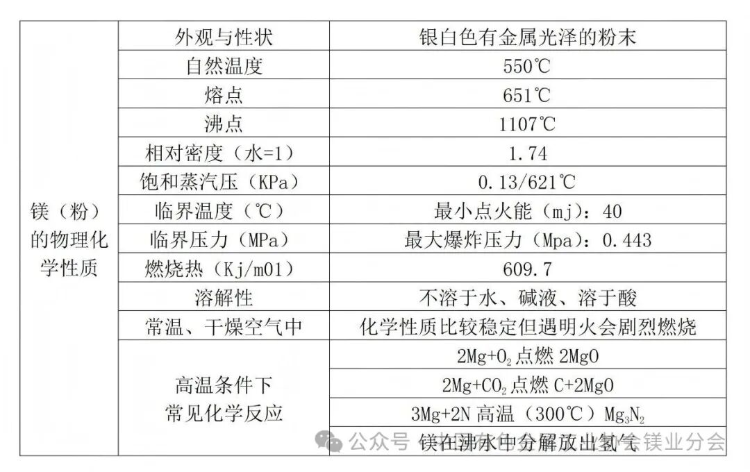 認(rèn)識是行為的向?qū)?,只有對金屬鎂(粉)的理化特性有一個準(zhǔn)確、清醒的認(rèn)識,才能在安全生產(chǎn)過程中正確、及時的指導(dǎo)安全生產(chǎn),如表1所示。
