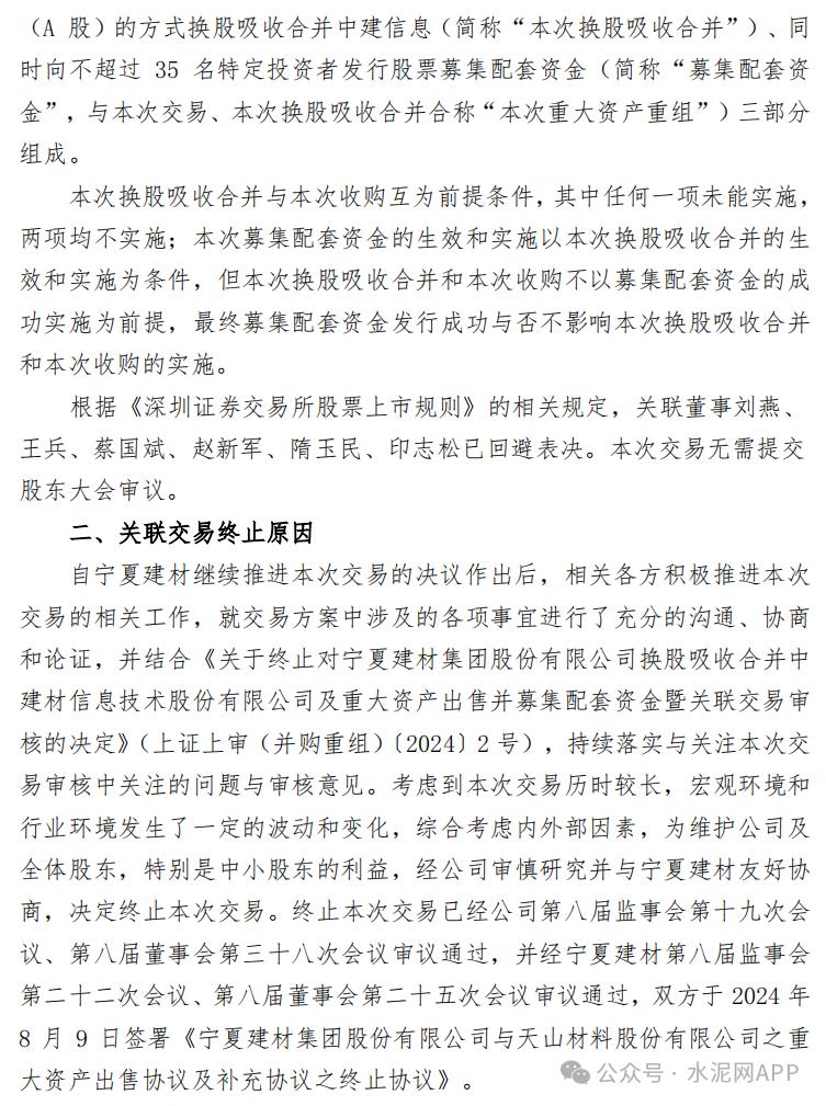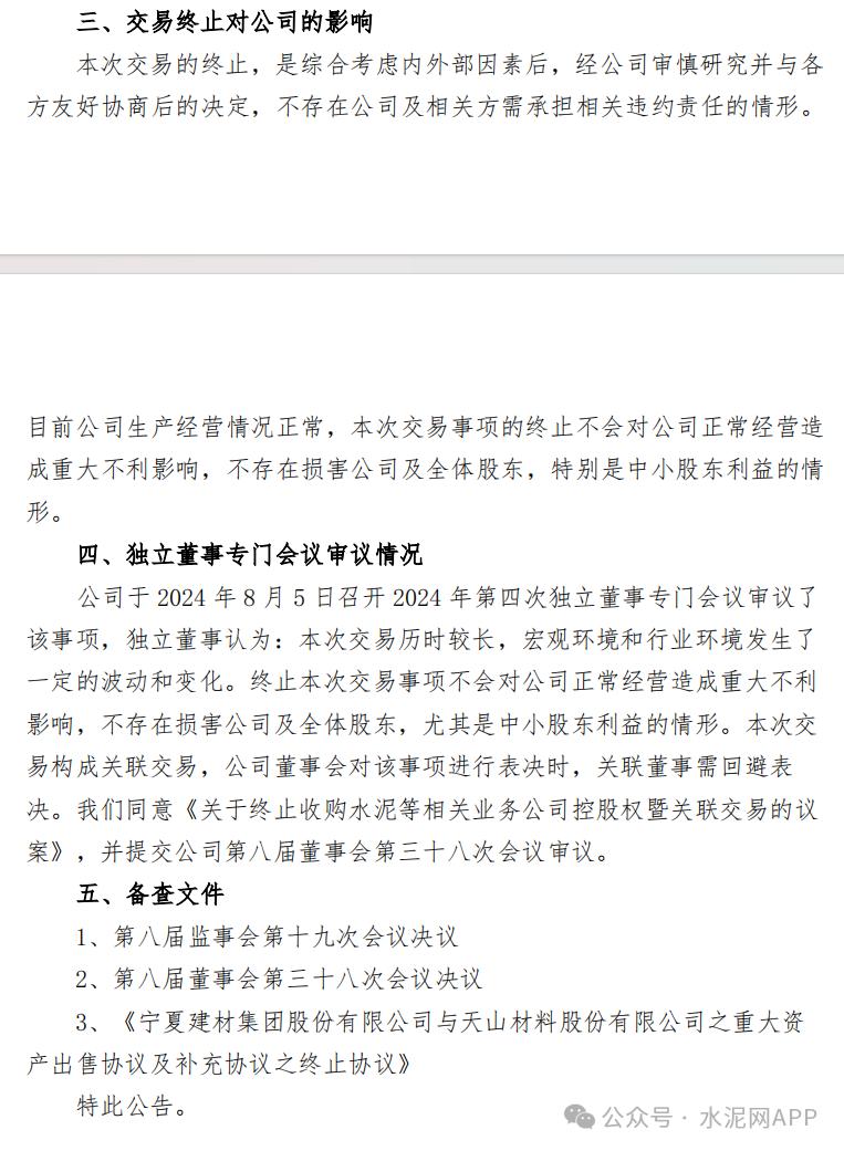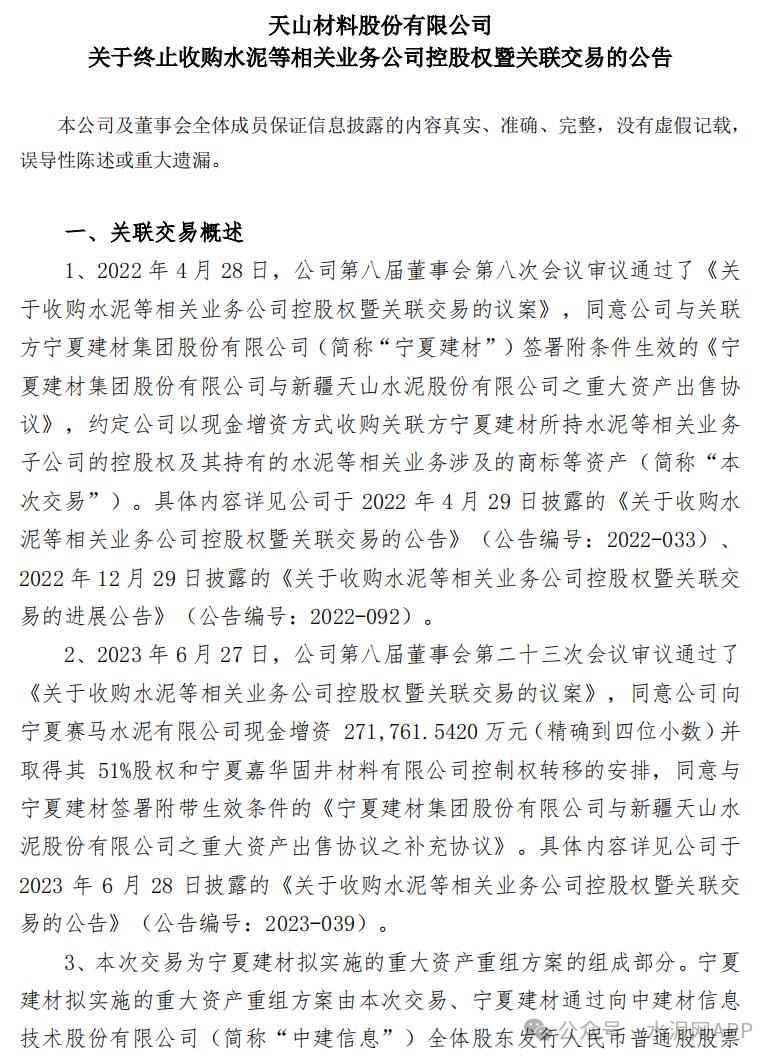 天山股份8月9日晚間公告,因交易歷時較長,宏觀環(huán)境和行業(yè)環(huán)境發(fā)生了一定的波動和變化,公司決定終止此前計劃收購關(guān)聯(lián)方寧夏建材所持水泥等相關(guān)業(yè)務(wù)子公司的控股權(quán)及其持有的水泥等相關(guān)業(yè)務(wù)涉及的商標(biāo)等資產(chǎn)的交易。天山股份同時公告,公司實控人中國建材集團(tuán)、控股股東中國建材股份正在積極研究論證關(guān)于基礎(chǔ)建材板塊相關(guān)企業(yè)的其他整合方案,并計劃在條件成熟后推進(jìn)。
