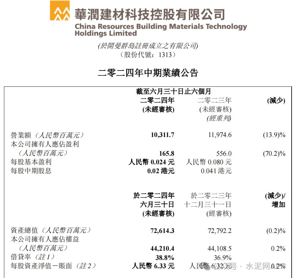 8月16日晚間,華潤(rùn)建材科技發(fā)布2024年中期業(yè)績(jī),公司上半年實(shí)現(xiàn)營(yíng)業(yè)收入103.12億元,同比下滑13.9%;公司擁有人應(yīng)占盈利(歸母凈利潤(rùn))1.66億元,同比減少70.2%。