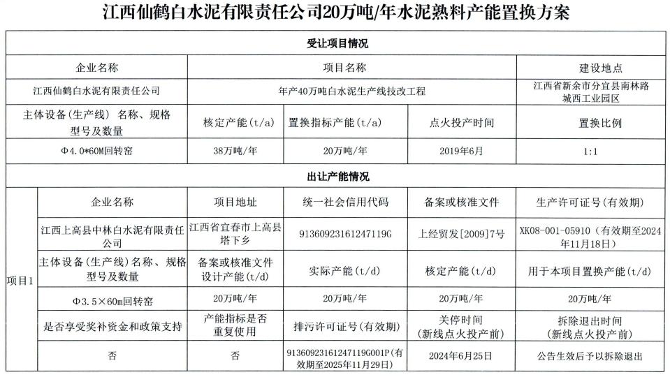 方案顯示,江西仙鶴白水泥有限責(zé)任公司通過整合受讓了江西上高縣中林白水泥有限責(zé)任公司年產(chǎn)20萬噸白水泥熟料產(chǎn)能,進行年產(chǎn)40萬噸白水泥生產(chǎn)線技改工程,置換比例1∶1。該項目已于2019年6月點火投產(chǎn)。