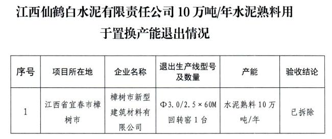 與此同時。江西工信廳另一則公示顯示,現(xiàn)用于江西仙鶴白水泥有限責(zé)任公司10萬噸/年水泥熟料產(chǎn)能置換的樟樹市新型建筑材料有限公司10萬噸/年水泥熟料生產(chǎn)線已按要求進行了拆除,不具備水泥熟料生產(chǎn)條件,并通過現(xiàn)場核查驗收。